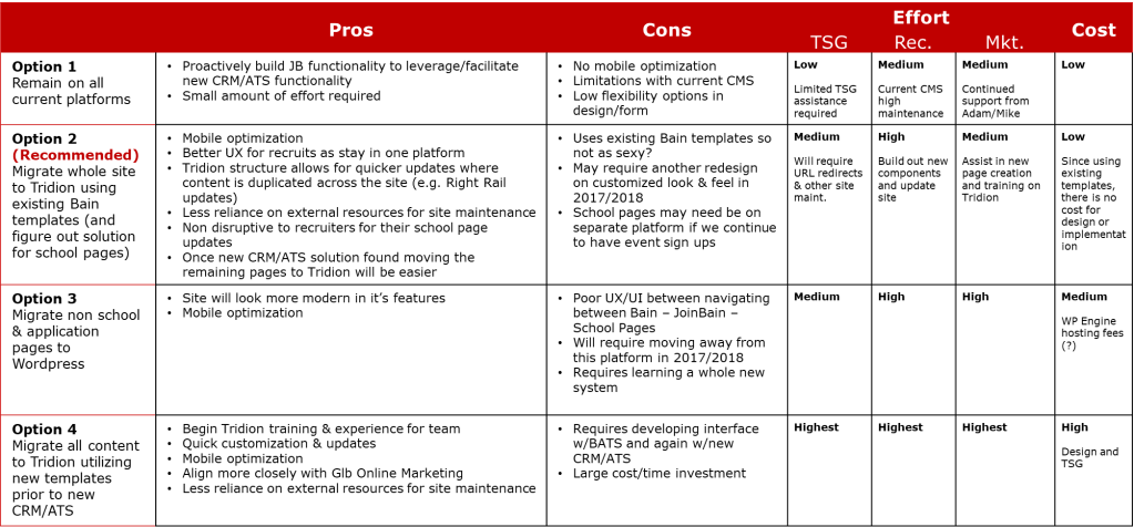 The following strategy options I presented to key business segment stakeholders after conducting the website quantitative analysis and speaking with product owners across multiple teams including IT, Recruiting/Design, and Corporate Marketing.
