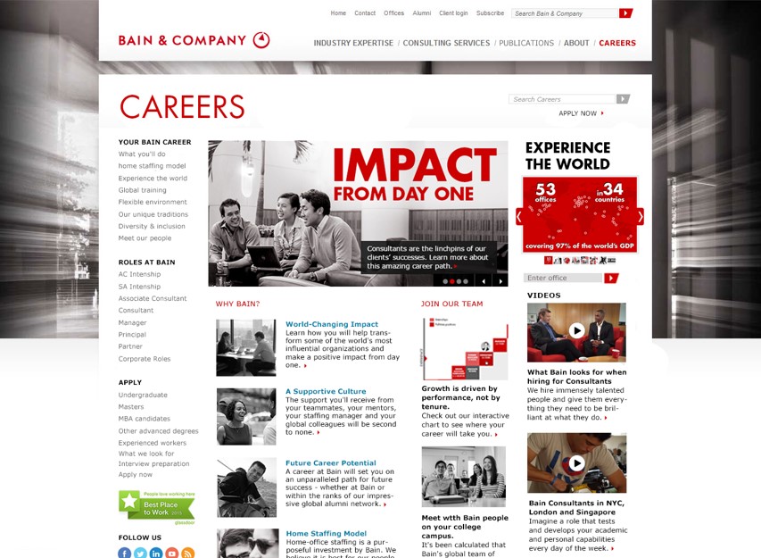JoinBain, our recruitment website, was originally a microsite not connected to the corporate website. First step was to review this initial design to find what was working well and should be prioritized during the design process.