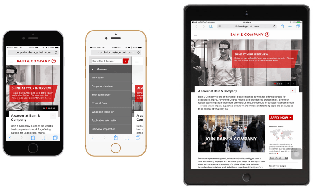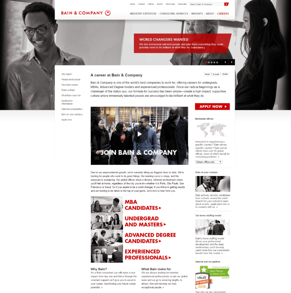 Founded in 1973, Bain & Company is a global management consulting firm known for its expertise in strategy, operations, and organizational improvement. JoinBain, the consultant recruitment microsite of Bain & Company, was operating on an outdated, non-responsive microsite and content platform that was not set to be upgraded for a few years until 2018.