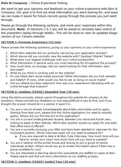| Research | Stakeholder Interviews | Meet with current consultants employed at Bain to understand their journey as they went through the recruitment process | November 2015 |