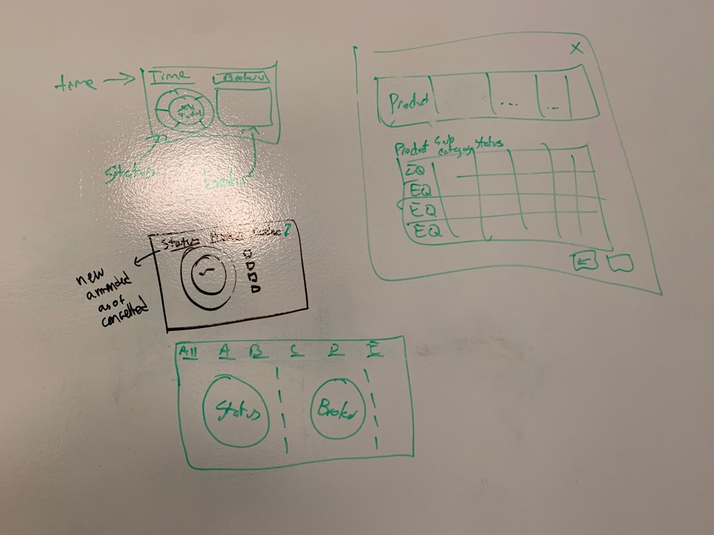 Leveraging findings from rigorous user research, particularly through methods like card sorting, I distilled crucial elements for the dashboard. These initial low-fidelity sketches on a whiteboard were instrumental in visualizing layout concepts and early interaction patterns. Collaboratively, we refined these sketches by eliminating confusing concepts and aligning with stakeholder priorities.