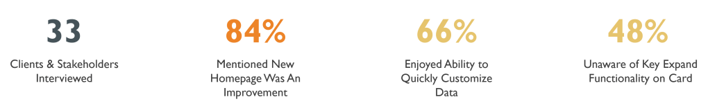 Thematic analysis of research identified key data needs and priorities for clients. This information was used to identify what cards belong on the homepage, what data should be included, and how we should prioritize development.