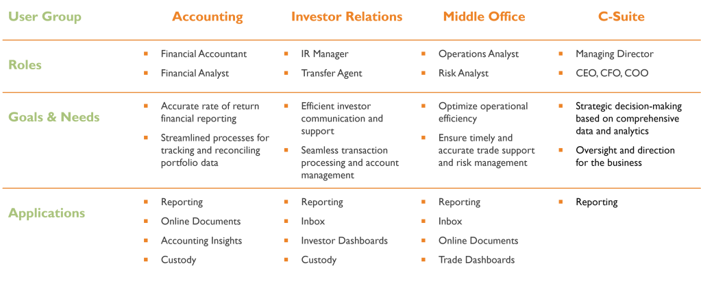 Overview: The primary goal for this project was to empower Alternatives segment clients by facilitating direct access to their data and services in MySS. This includes developing an enriched user interface that not only caters to these needs but also enables users to craft personalized views pertinent to their respective roles. By achieving this, the project strives to enhance accessibility and usability, thereby maximizing the utility and satisfaction of our clients.