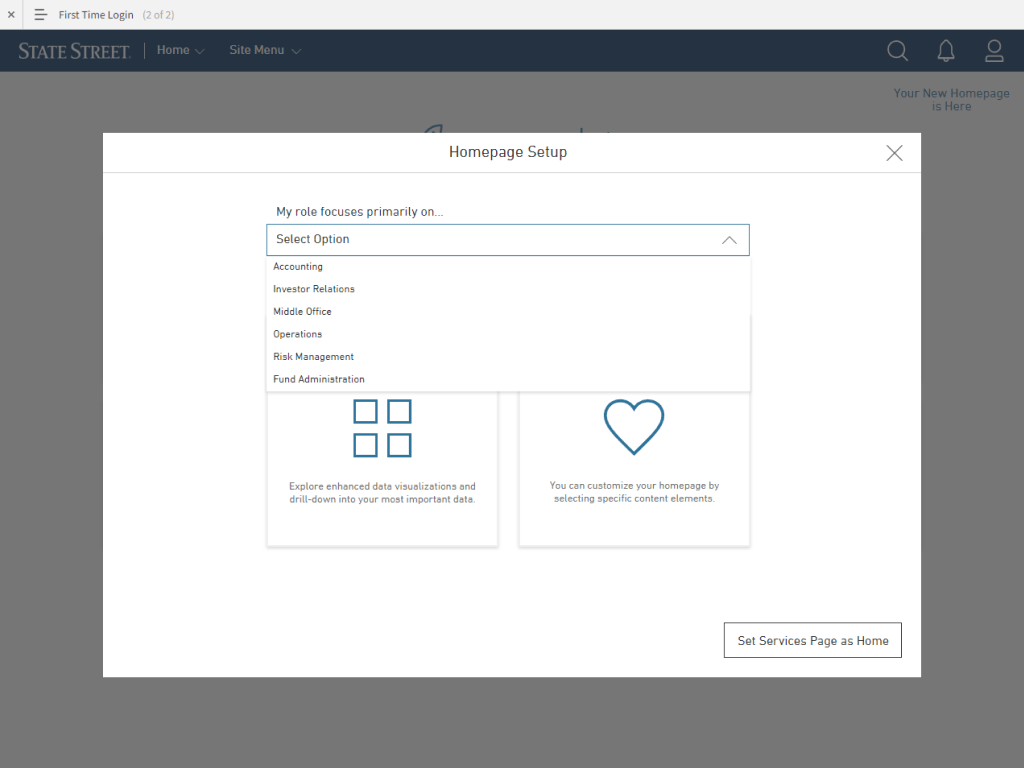 Once users go through the simple onboarding process, they select to Set Up Their Homepage. The following steps were designed to allow a user to go to an auto-generated homepage based on their role, or allow them to customize what cards were displayed.